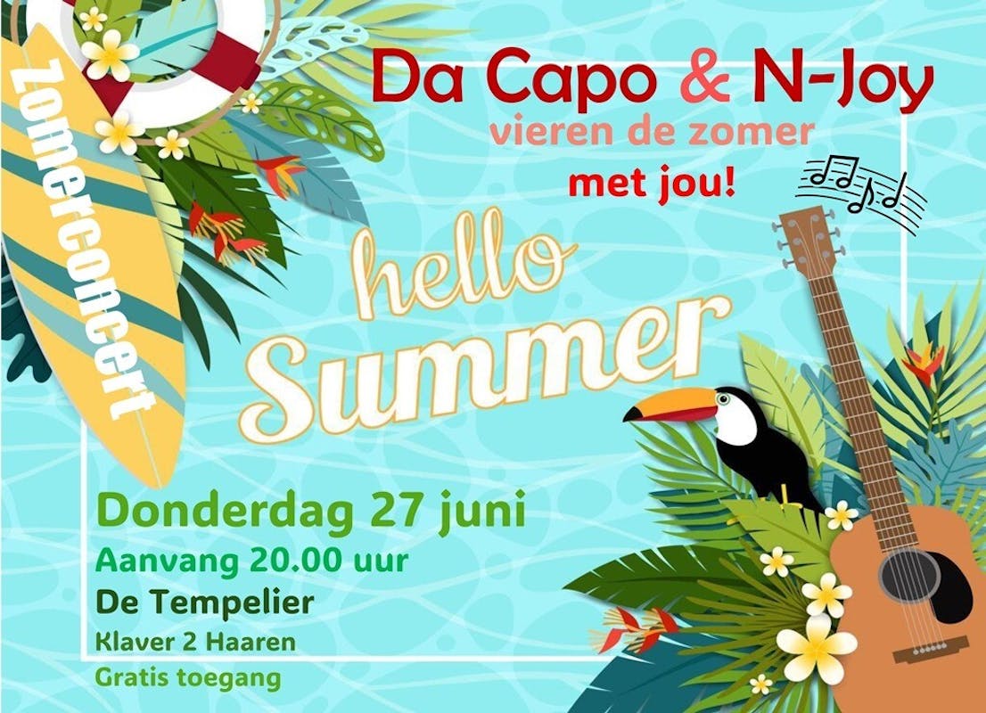 Wil je alvast in de vakantiestemming komen? Kom dan op een hopelijk zomerse avond genieten van een informeel gezellig concertje door de twee bevriende Haarense zanggroepen Da Capo en N-Joy. We heten iedereen van harte welkom bij de Tempelier in Haaren, Klaver 2 op donderdagavond 27 juni, 20.00u. Gratis entree. Bij mooi weer buiten, bij minder mooi weer binnen.
