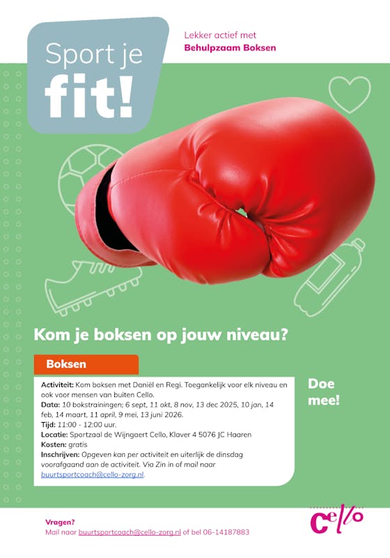 Kom op jouw niveau boksen met Daniël en Regi! 1x in de maand organiseren we een boksactiviteit speciaal voor mensen met een verstandelijke beperking. Niet alleen voor cliënten van Cello maar ook toegankelijk voor mensen uit de rest van de gemeente. Deelname is gratis en niveau wordt afgestemd op de aanwezigen, maximaal 12 deelnemers per keer!