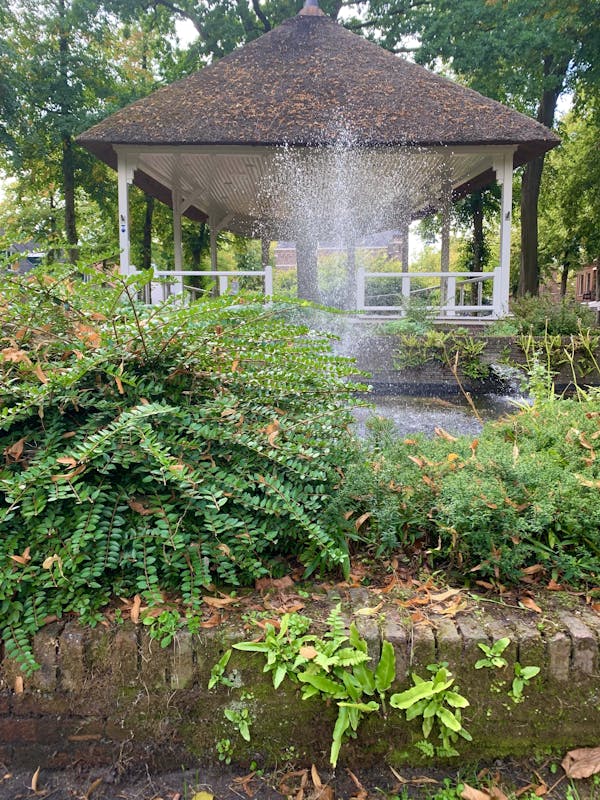 Aan de andere kant van de muziektent ligt de oude fontein uit 1946. De lage muurtjes hebben nog zachte kalkrijke voegen waarin onder andere tongvarens kunnen groeien. Een mooi voorbeeld van hoe natuur en cultuur kunnen samengaan als we daar zorgvuldig mee omgaan. In voegen met modern cement kan dit plantje niet meer wortelen.