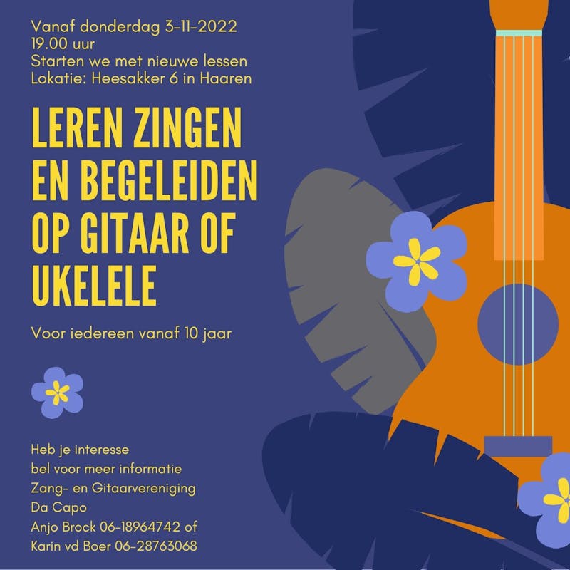 Bij zang- en Gitaarvereniging Da Capo leer je in groepsverband samen zingen en je leert jezelf te begeleiden op gitaar of ukelele.