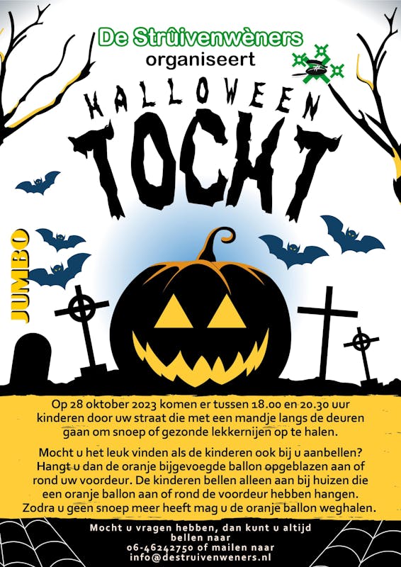 Halloweentocht in twee delen: een enge tocht voor de wat oudere kinderen die wel van griezelen houden en een spannende tocht voor de kleinere kinderen onder begeleiding van ouders.