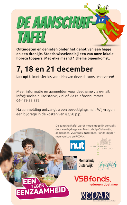 Meer informatie en aanmelden voor deelname via email: info@sociaalhuisoisterwijk.nl of via 06-479 33 872.