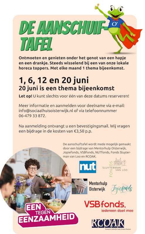 Meer informatie en aanmelden voor deelname via email: info@sociaalhuisoisterwijk.nl of via 06-479 33 872.