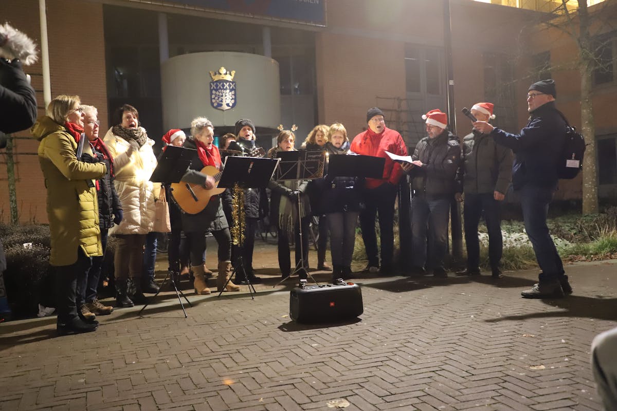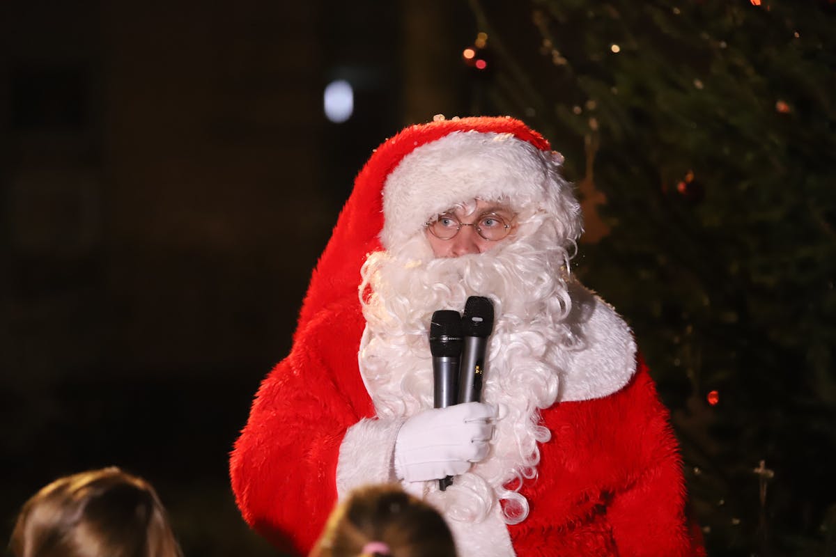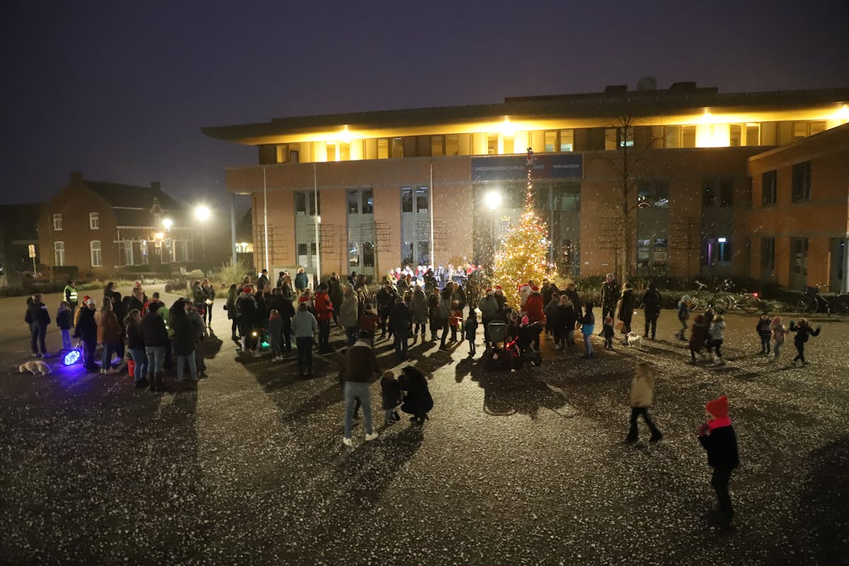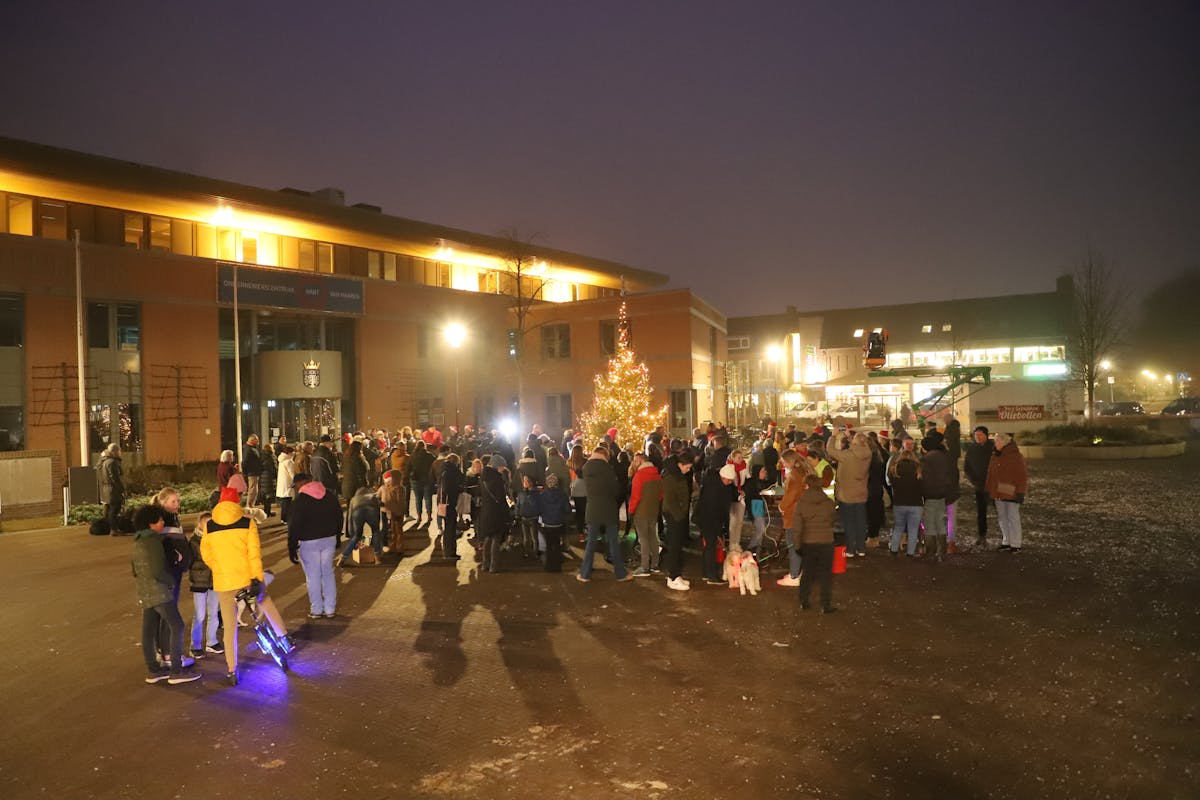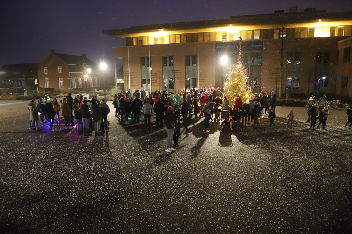 Leuk, dat er daarom dit jaar een klein evenement was, waarbij een heleboel kinderen en ouders bij waren, toen de kerstman de lichtjes in de boom aanstak.