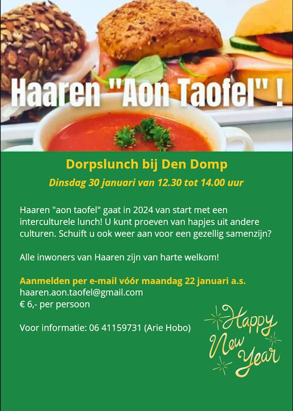 Op dinsdag 30 januari organiseert de werkgroep Haaren aon taofel weer een gezellige dorpslunch! Komende keer genieten we van hapjes uit andere culturen. De kinderen van De Sprankel helpen zoals altijd weer mee.