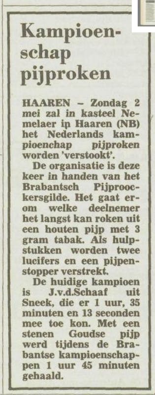 In een krantenartikel van 1982 bleek, dat er in dat jaar een wedstrijd tabaksroken was in ons kasteel Nemerlaer: