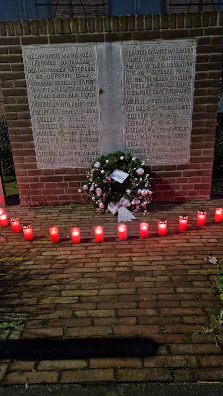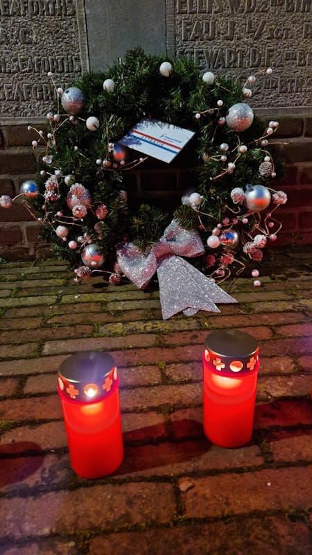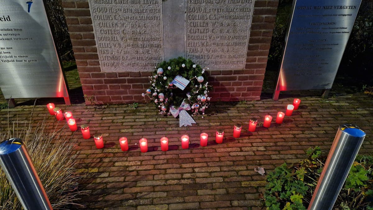 Op Kerstavond hebben we 18 kaarsen ontstoken bij het oorlogsmonument op ons plein. Daarbij zijn de namen voorgelezen van omgekomen bevrijders, burgers, militairen en verzetsmensen.
