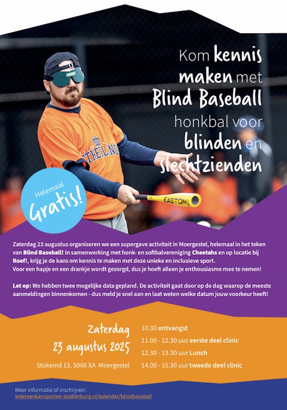 Zaterdag 23 augustus, aanstaande zaterdag, wordt er een supergave activiteit in Moergestel georganiseerd, helemaal in het teken van Blind Baseball, voor blinden en slechtzienden. In samenwerking met honk- en softbalvereniging Cheetahs en op locatie bij Roef!, krijg je de kans om kennis te maken met deze unieke en inclusieve sport.