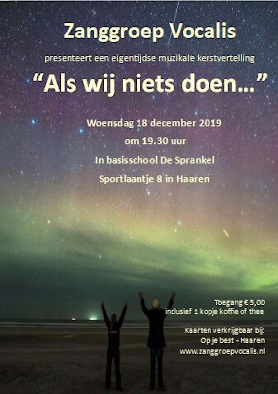 "Als wij niets doen,..."onze voorstelling van vorig jaar was een groot succes. En daarom, dit jaar op herhaling. Op een nieuwe locatie. Het is een eigentijds muzikale vertelling van het eeuwenoude kerstverhaal. Je ziet het op woensdag 18 december om 19.30 uur in basisschool De Sprankel.