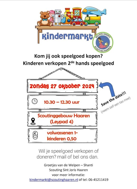 Scouting Haaren houdt zondag 27 oktober een tweedehands speelgoedmarkt van 10.30 tot 12.30 uur in haar clubgebouw aan het Leypad 4. Kinderen kunnen hier hun speelgoed verkopen waar zij zelf niets meer mee doen, maar waar anderen nog veel speelplezier uit kunnen halen.