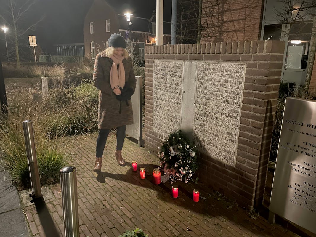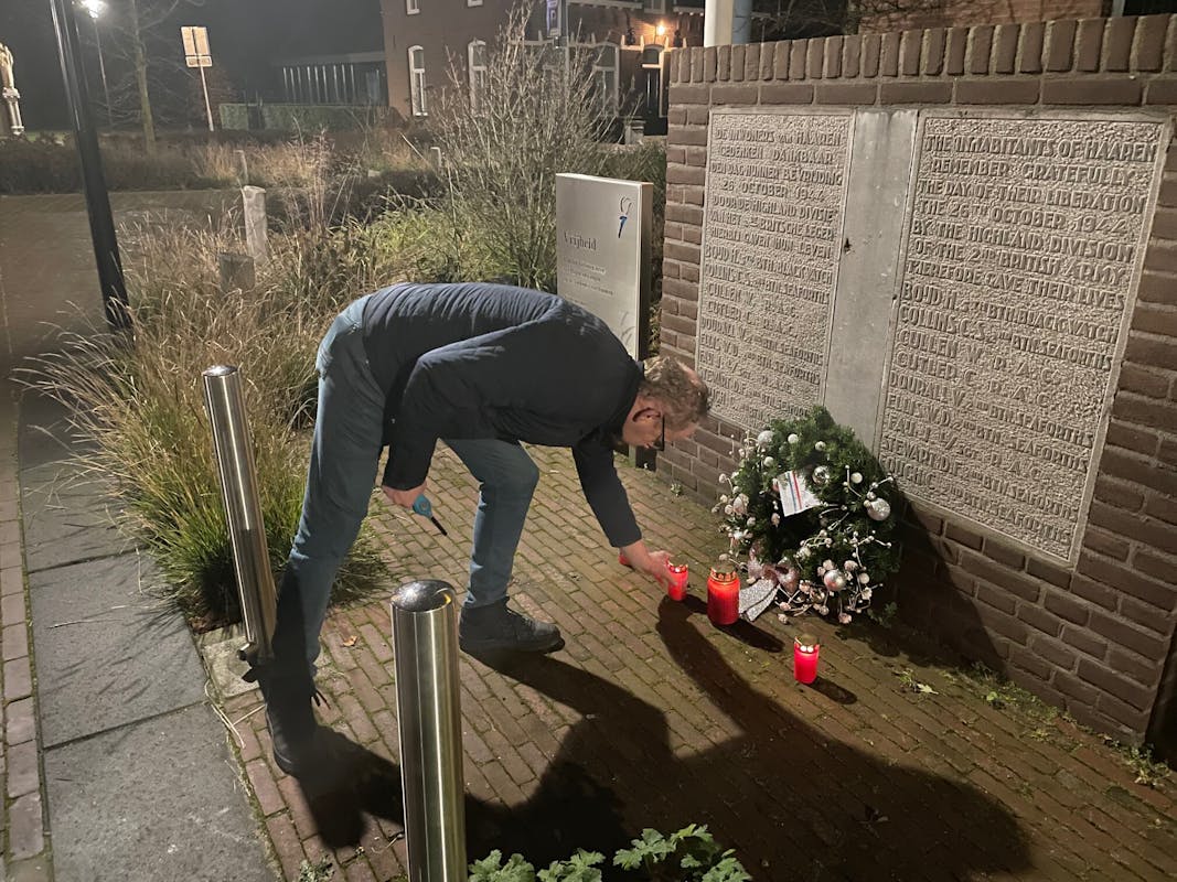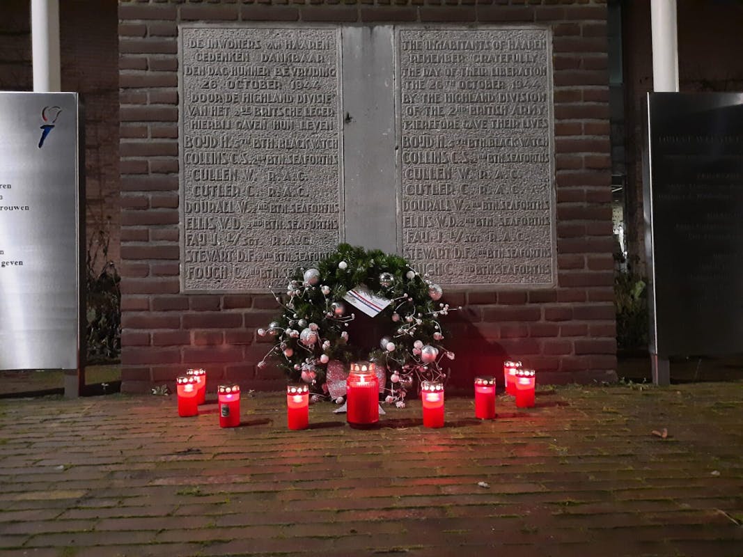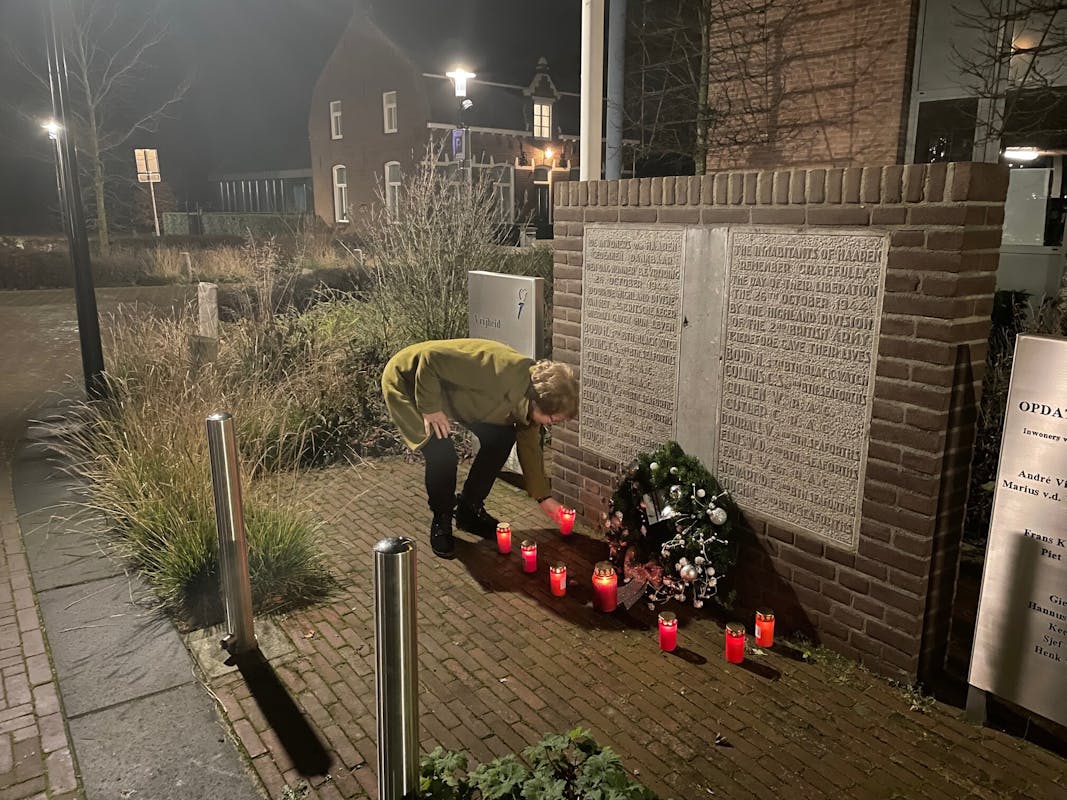 OP kerstavond deden we als comité mee met een landelijk initiatief, wat in 2015 is ontstaan: we brandden kaarsen bij ons oorlogsmonument op het Mgr. Bekkersplein.