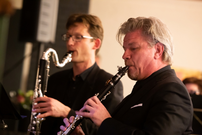 Eigen solisten, zoals een klarinet duo, een trompetkwintet, solist op klarinet én een aansprekende programmering voor het harmonieorkest.