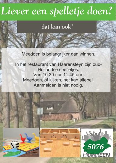Kent u ze nog de spelletjes van vroeger? Op zaterdag 22 september vindt u ze in het restaurant van Haarensteyn, van 10.30 tot 11.45 uur. Meedoen, of kijken. Het mag allebei.