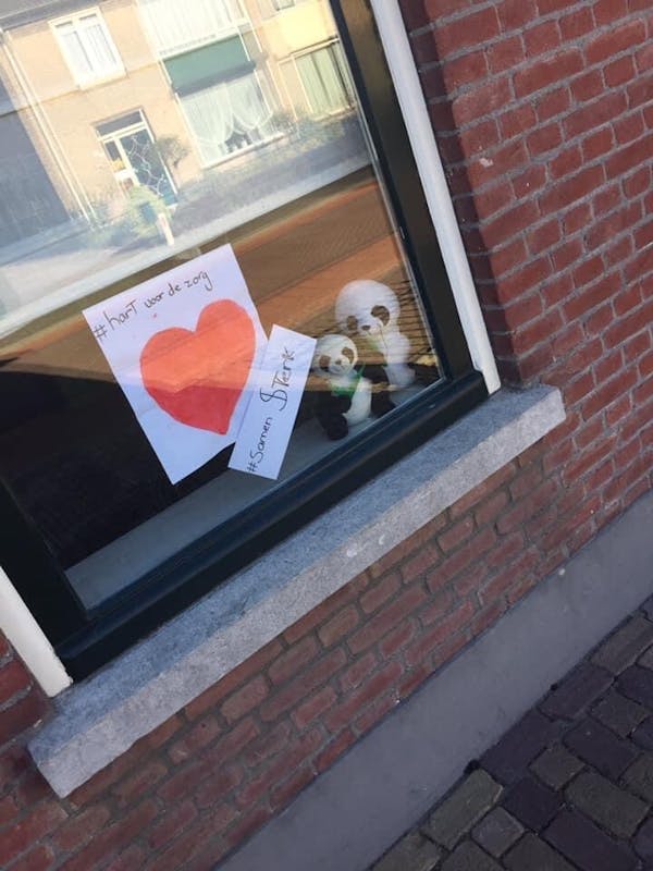 - Achter steeds meer ramen mooie tekeningen, om elkaar een hart onder de riem te steken. Bedankt Janne en Lize.
