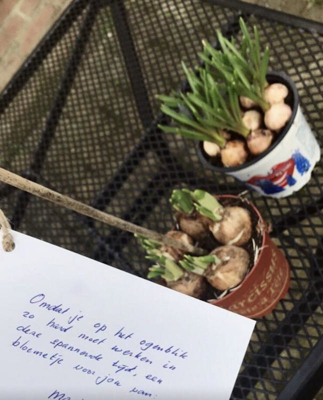 - Zomaar een leuk bloemetje op de tuintafel gezet, met een 'dankjewel, dat jij in het ziekenhuis voor iedereen zorgt'.