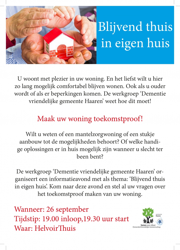 De thema-avond 'Blijvend thuis in eigen huis' wordt georganiseerd door de werkgroep 'Dementie Vriendelijke Gemeente Haaren' en vindt plaats op woensdag 26 september in het HelvoirThuis, Kloosterstraat 30 te Helvoirt. Inloop vanaf 19 uur, Aanvang 19,30 uur en einde 21,30 uur. De toegang en de koffie of thee zijn gratis.