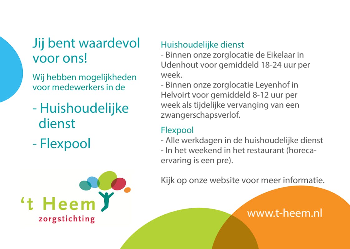Ter uitbreiding van onze flexpool zijn we voor onze vier zorglocaties, waaronder Haarensteyn, op zoek naar oproepkrachten Huishoudelijke Dienst. Je wordt ingezet tijdens vrije,...