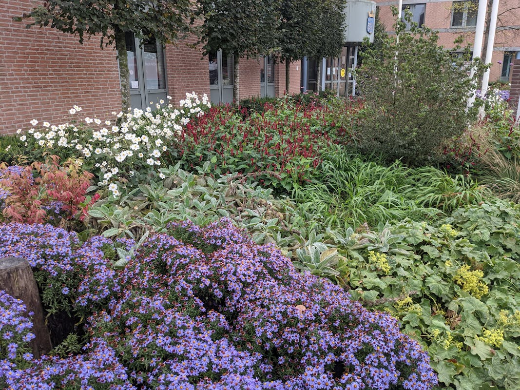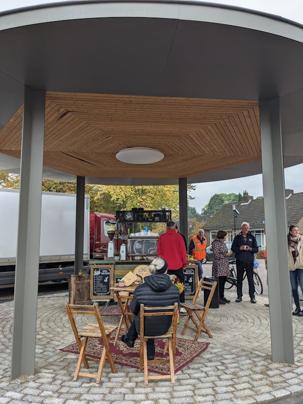 Vanochtend een verrassing: de kiosk werd ingewijd door een koffie kiosk. Heerlijke koffie. Verder een foto van de bloemperken die er zo prachtig bijstaan. Wat boffen we daarmee in Haaren!