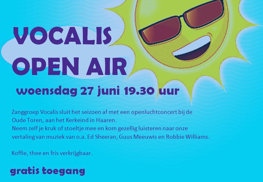Er komen een paar mooie dagen aan! Zanggroep Vocalis sluit het seizoen af met een openluchtconcert bij de Oude Toren, aan het Kerkeind in Haaren.