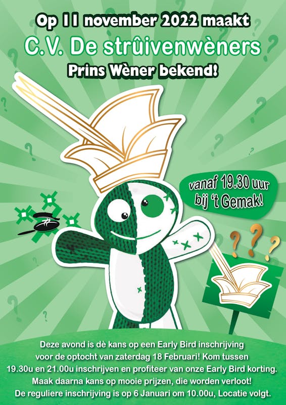 CV De Strûivenwèners presenteert deze avond de nieuwe Prins Wèner in café ’t Gemak aan de Haarendijk. Het feest begint vanaf 19.30 uur. Een duur kaartje kopen is niet nodig, want de entree is gratis. Ook zijn artiesten als Lamme Frans, De Dorini’s, Veul Gére en vele andere te horen. Niet live, maar wel gedraaid door de dj van dienst!