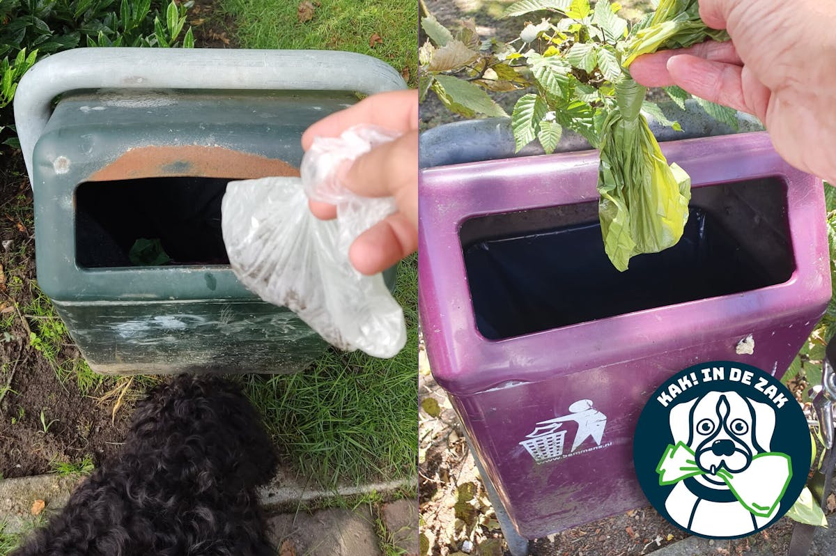 volle hondenpoepzakjes mag je in alle afvalbakken in de openbare ruimte achterlaten … Kak in de zak, mag in iedere bak! Mee naar huis nemen en in je eigen kliko gooien mag natuurlijk ook.