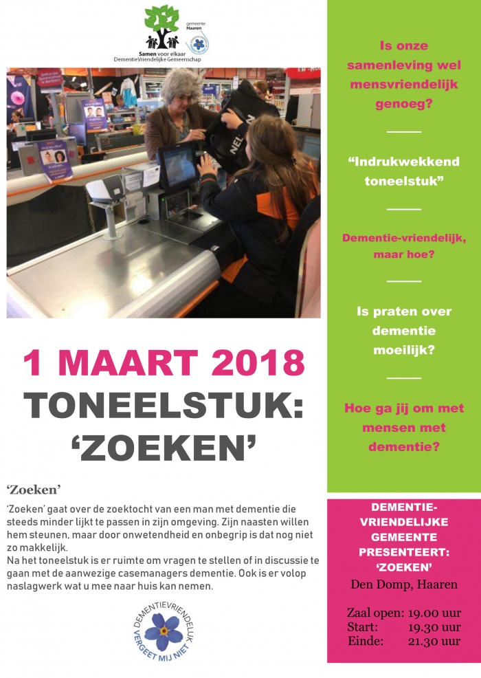 Op donderdag 1 maart kunt (of misschien wel moet) u hier een avond bij stilstaan via het toneelstuk 'zoeken' dat geschreven is om een aanzet te geven voor een discussie waarbij we op al deze vragen zoeken naar een antwoord. Een eenduidig antwoord kan niet gegeven worden maar het onderwerp dementie is geen taboe meer en de dialoog hierover is geopend.