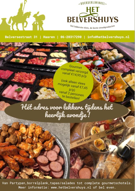 Jij de sinterklaas of kerstinkopen en het maken van surprises? Zorgen wij voor een heerlijke gourmetschotel, een goedgevulde borrelplank of ander lekkers. Bekijk onze decemberfolder voor alle mogelijkheden.