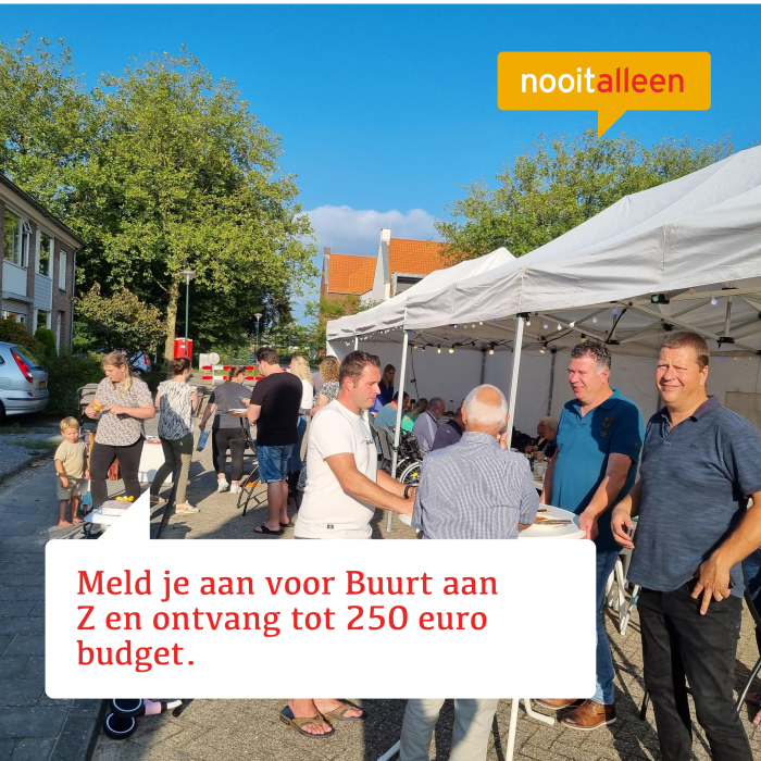 Wil je iets organiseren voor jouw buurt of wijk? Via Buurt aan Z vraag je hiervoor geld aan. Je krijgt dan een bijdrage van maximaal 250 euro. Met Buurt aan Z nodigen we je uit om samen met de straat of buurt iets te organiseren.