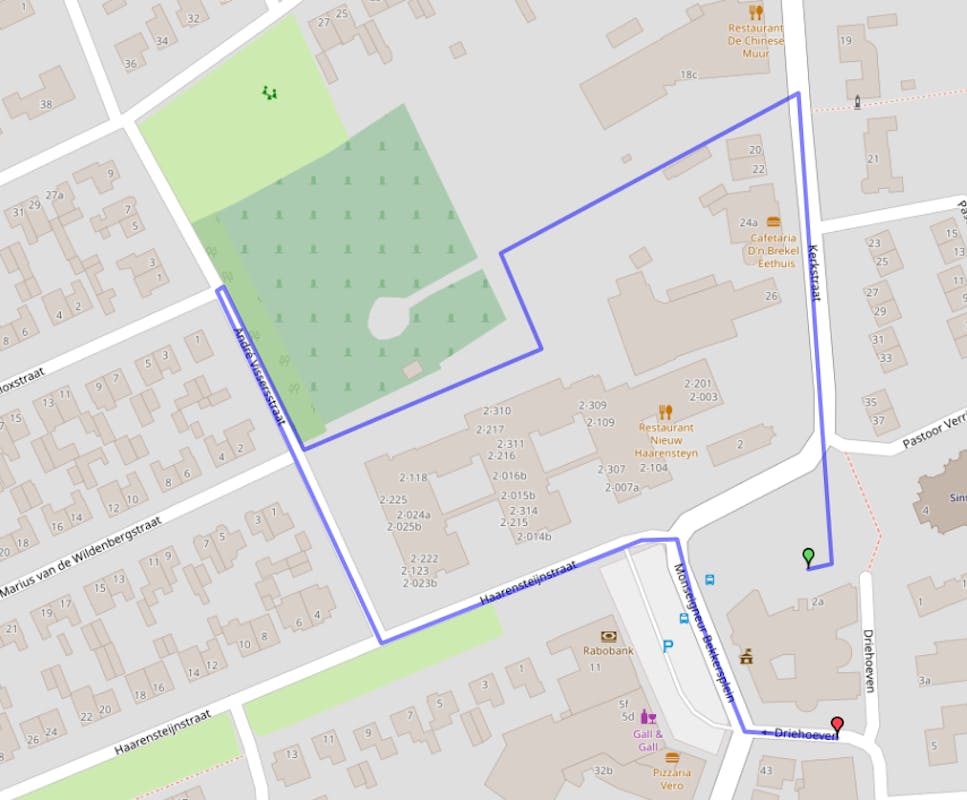 We wandelen een route van ca 850 m. (zie kaartje) over verharde paden/wegen, waarin we een paar keer stil staan voor muziek, een lied en gedicht.