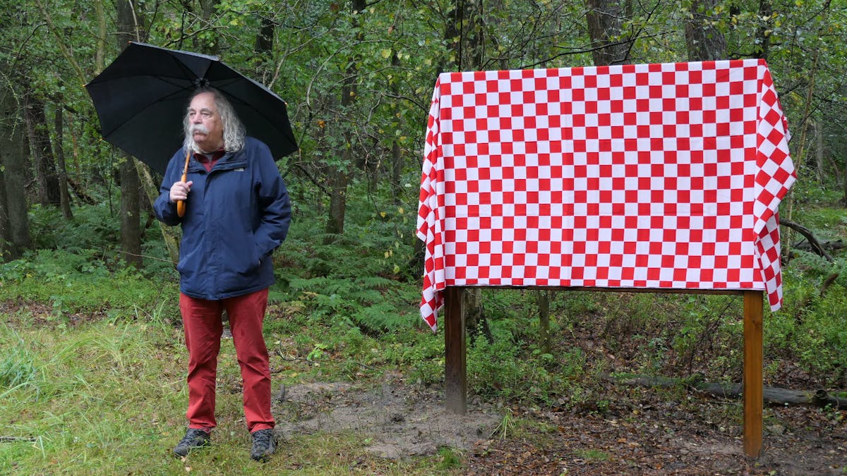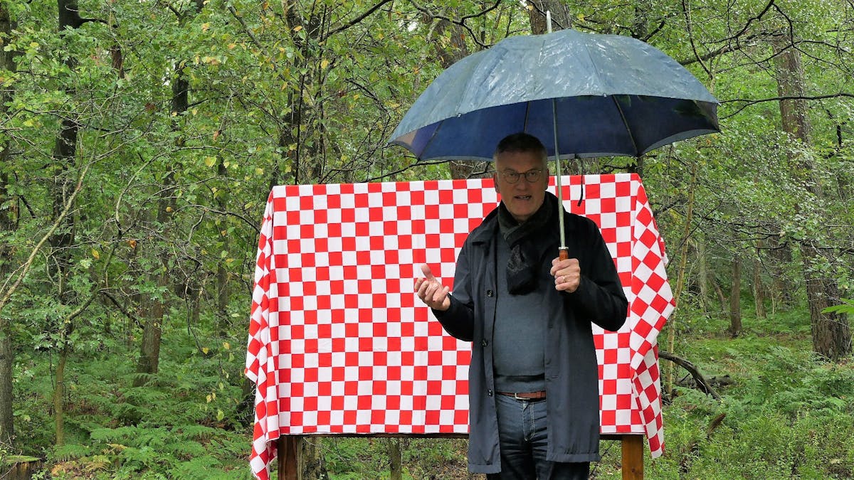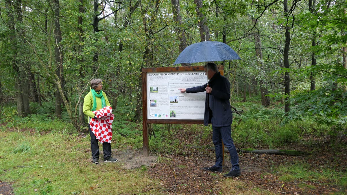 Niet gehinderd door de stromende regen heeft burgemeester Hans Janssen afgelopen zondag kort na twaalf uur een informatiebord onthuld aan de Bosweg in Oisterwijk. Dit markeert het nieuwe geografisch middelpunt van de gemeente Oisterwijk. “Het is goed dat dit initiatief is genomen”, complimenteerde de burgemeester onder het toeziend oog van de videocamera’s van LOVO.