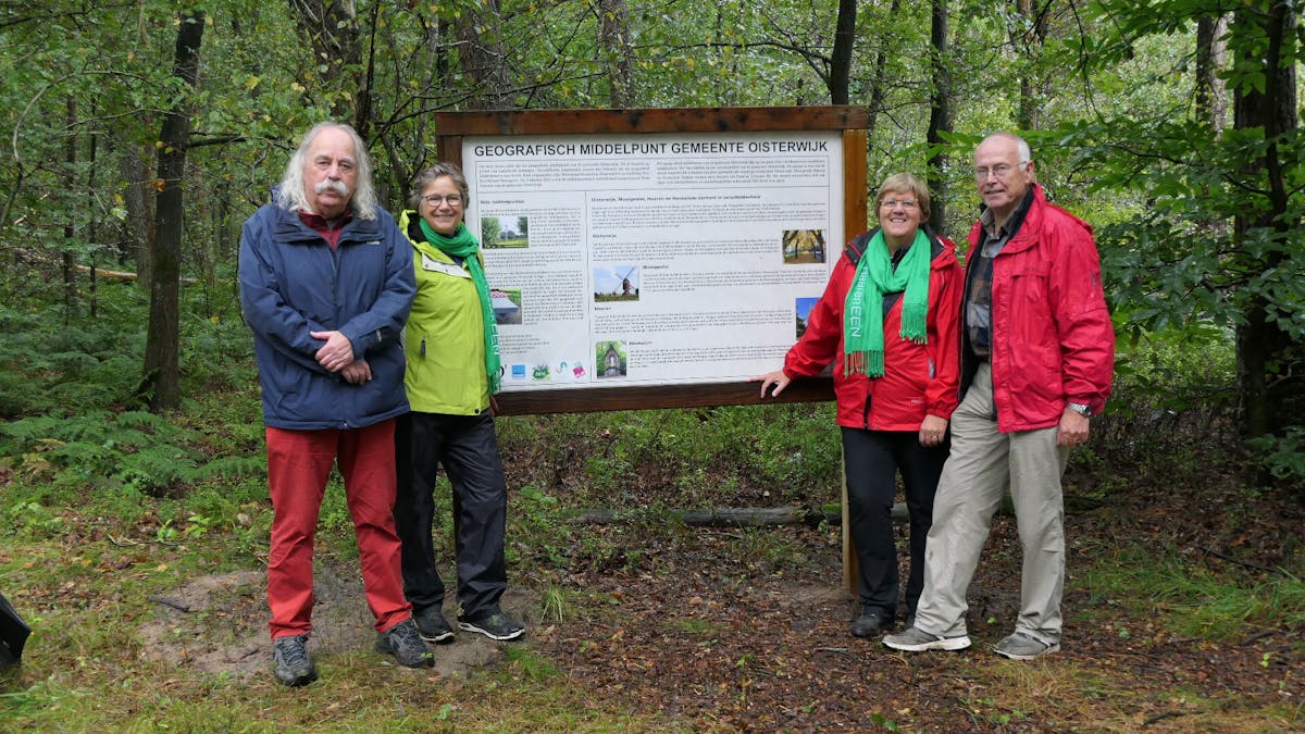 De werkgroep die het nieuwe geografisch middelpunt realiseerde: Dré van Hal (vanuit Heukelom), Marion Denissen (HaarenEEN), Tiny Vermeer (HaarenEEN) en Paul Spapens (WieKentKunst Moergestel). De vijfde gangmaker, Frans Kapteijns (Natuurmonumenten), kon niet aanwezig zijn.