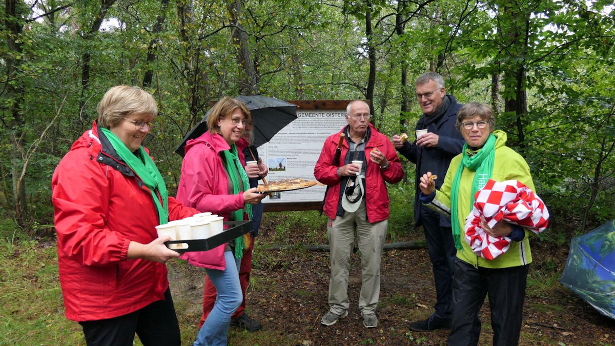 Onder het genot van Haarense Tuintjes en Oisterwijkse Heren (plaatselijke lekkernijen) en bekertjes appelsap (vers geperst van de appels uit de boomgaard van Dré van Hal) vertelde Tiny Vermeer nog dat de onthulling afgelopen zondag pas een begin is. Komend voorjaar wordt nabij het nieuwe geografisch middelpunt een festival van de cultuur uit de vier dorpen gevierd. “En dan is iedereen uit Haaren, Heukelom, Moergestel en Oisterwijk welkom”, nodigde ze alvast uit.