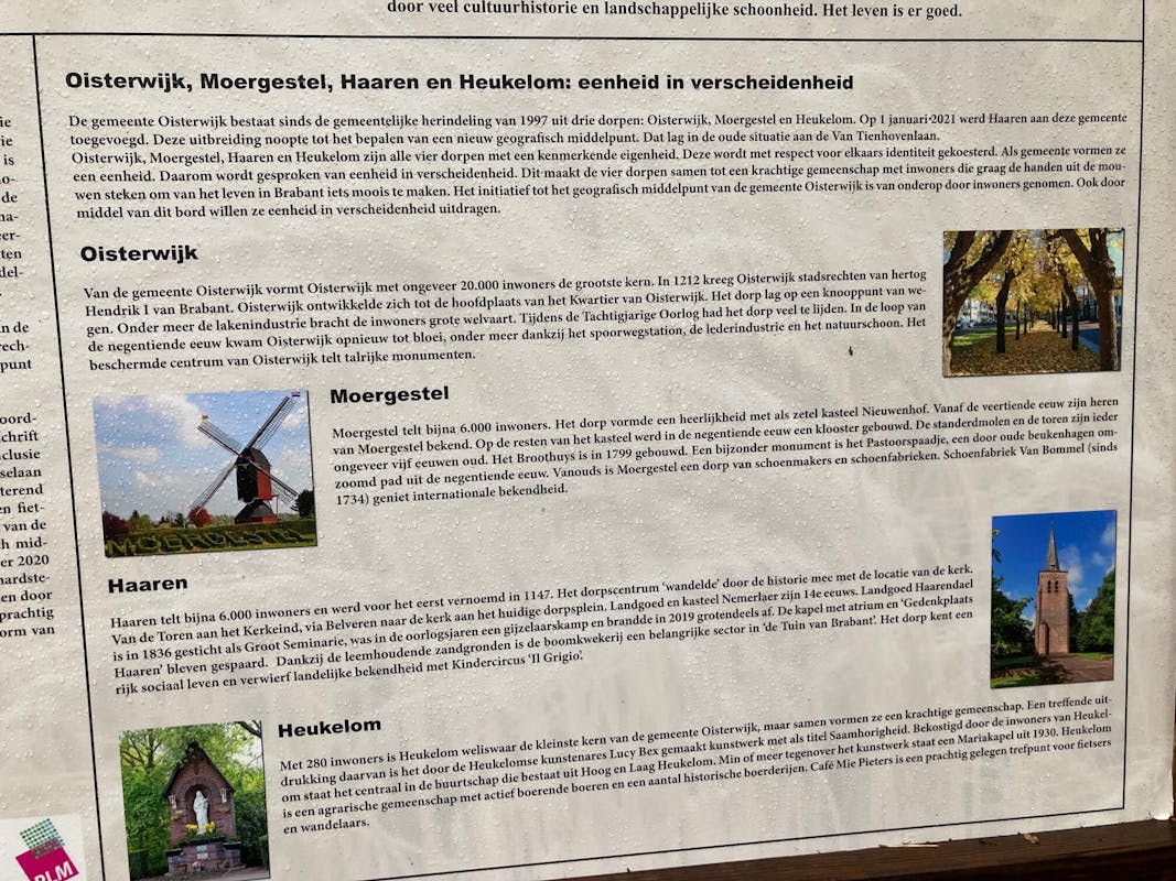 Op grond van kadastrale metingen werd duidelijk dat het nieuwe middelpunt aan de Bosweg ligt. Dat is helemaal niet zo ver verwijderd van het vorige, maar dat komt, verduidelijkte Tiny Vermeer, doordat Haaren eigenlijk náást Oisterwijk ligt. Iedereen die hier langskomt – en dat zijn dagelijks heel veel fietsers en wandelaars – kan zien dat Haaren, Heukelom, Moergestel en Oisterwijk zijn verenigd rond een geografisch middelpunt. Het was Hans Janssen die wees op die bijzondere vorm van identiteitsvorming.